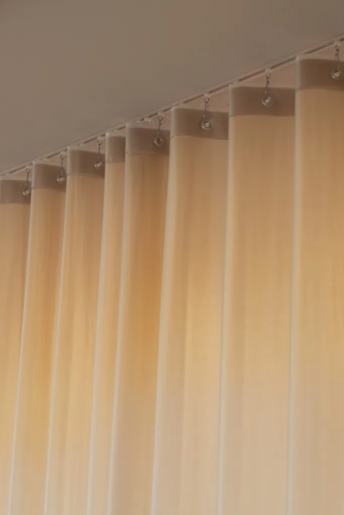 ビニールと薄地カーテンを二重にすることで、目隠しとしての機能性は担保しつつ、人の気配は少し感じられるような軽やかなカーテンに仕立てた。