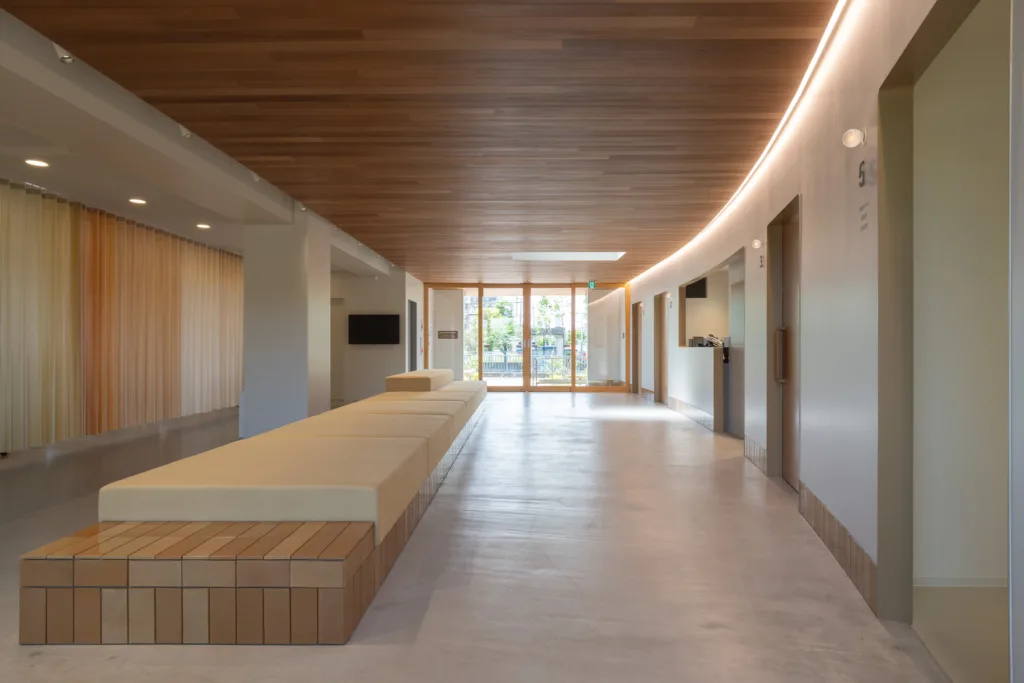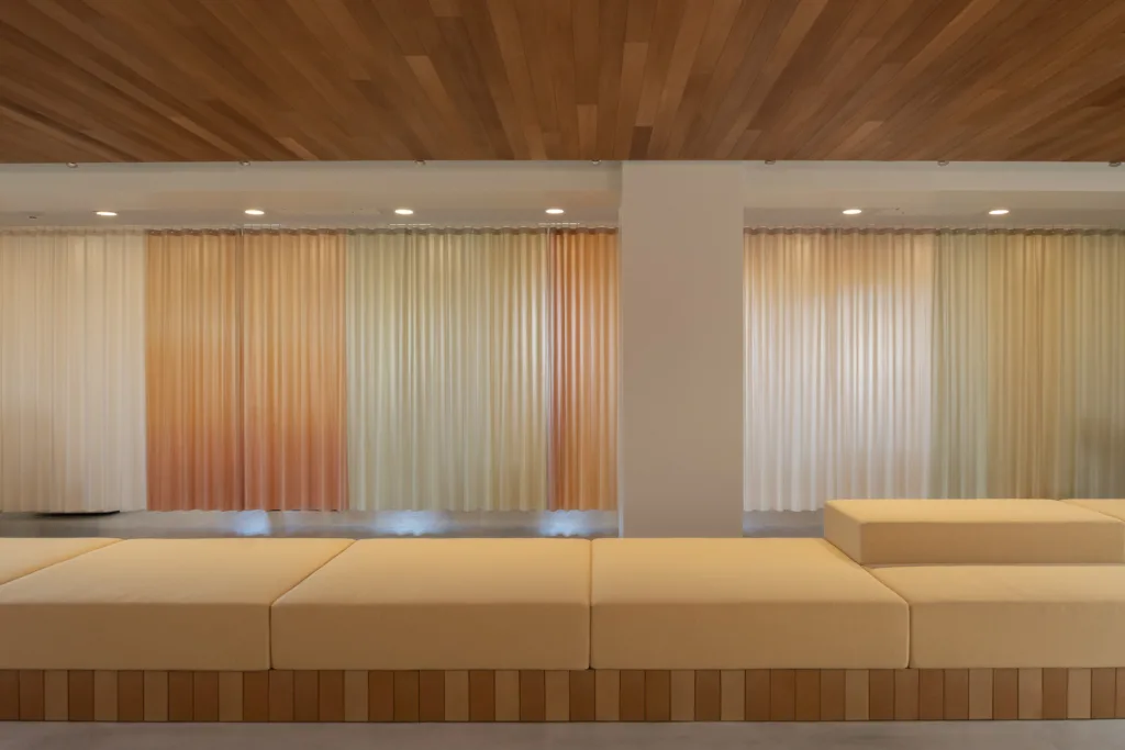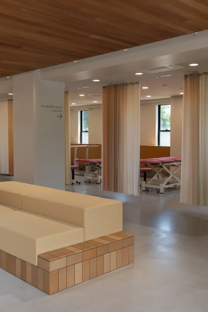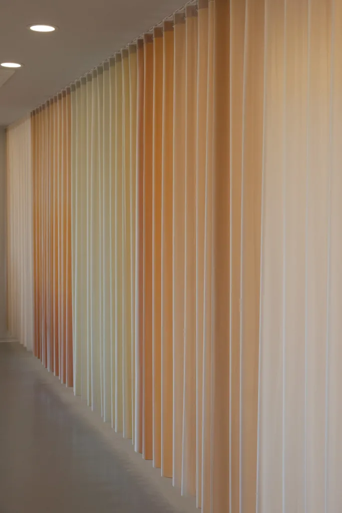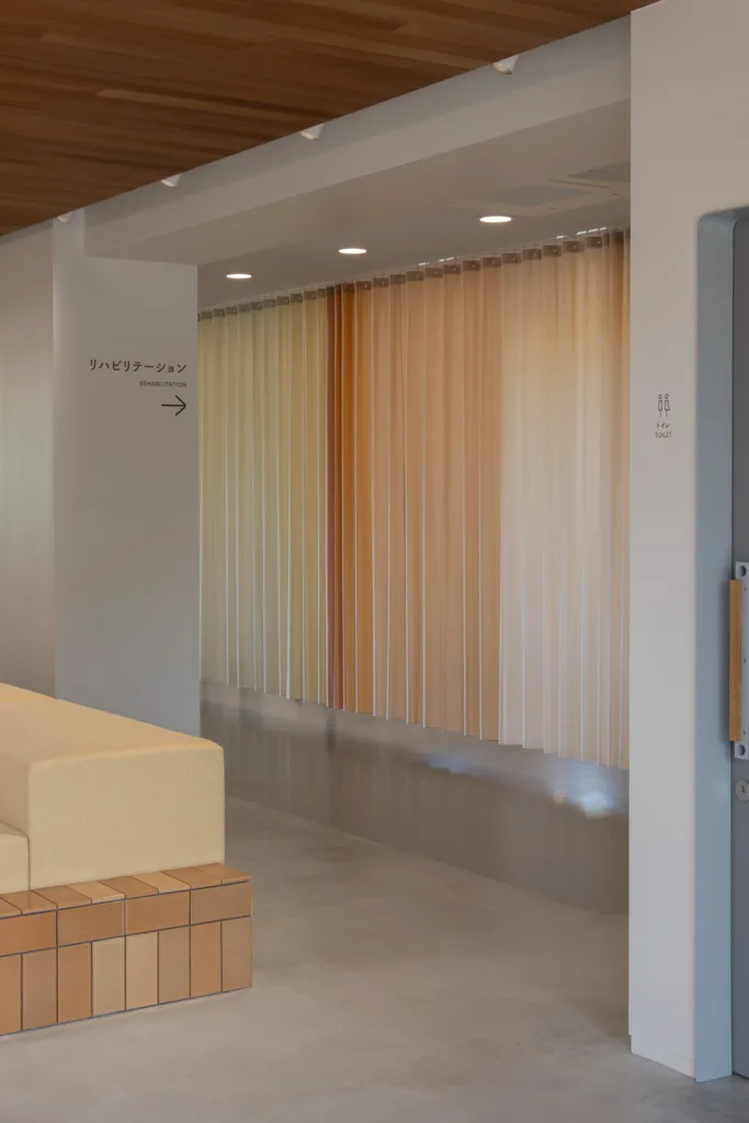 千葉県市川市にあるクリニックにて、リハビリステーションと受付を仕切るカーテン。空間の大きな面積を占めるカーテンが壁のような存在になるのではなく、クリニック内の色がふんわりと滲んだような、空間に溶け込む仕切りになることを目指した。