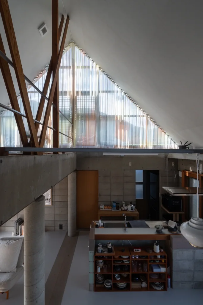 今回採用した薄地のレースカーテンは光に当たると、生地の存在が希薄になり、色だけが漂っているような印象を受ける。 たっぷり光が入る大きな三角窓に、目にすることはできない生活の香りや音を掬い出すように生地を染め、カーテンを制作しました。