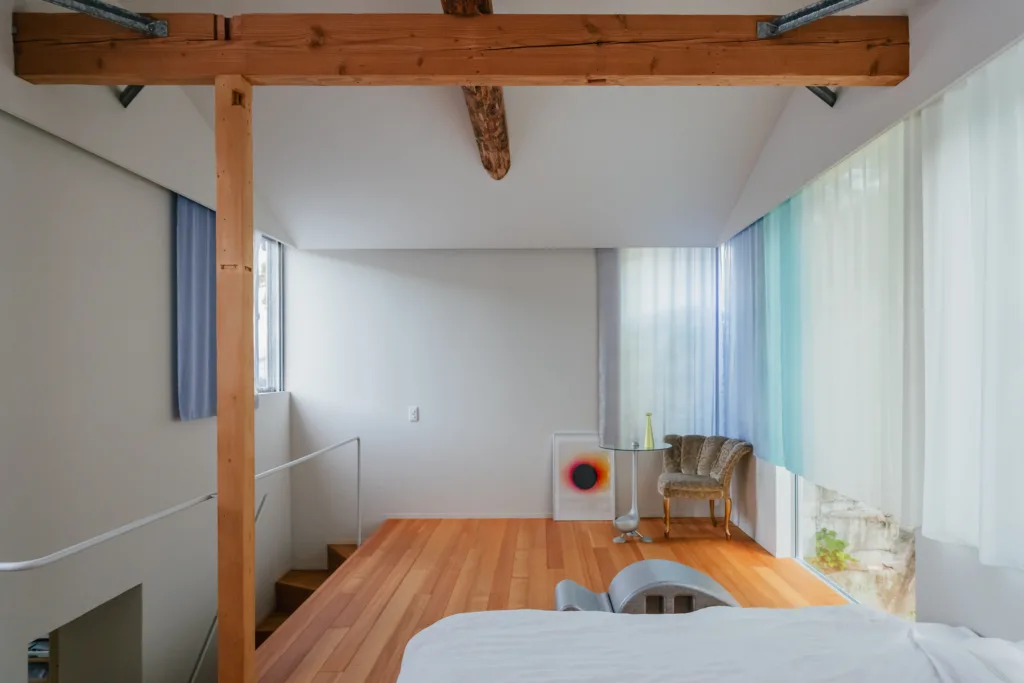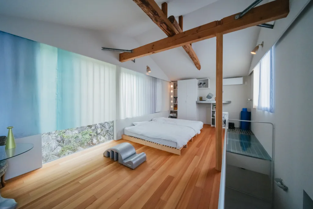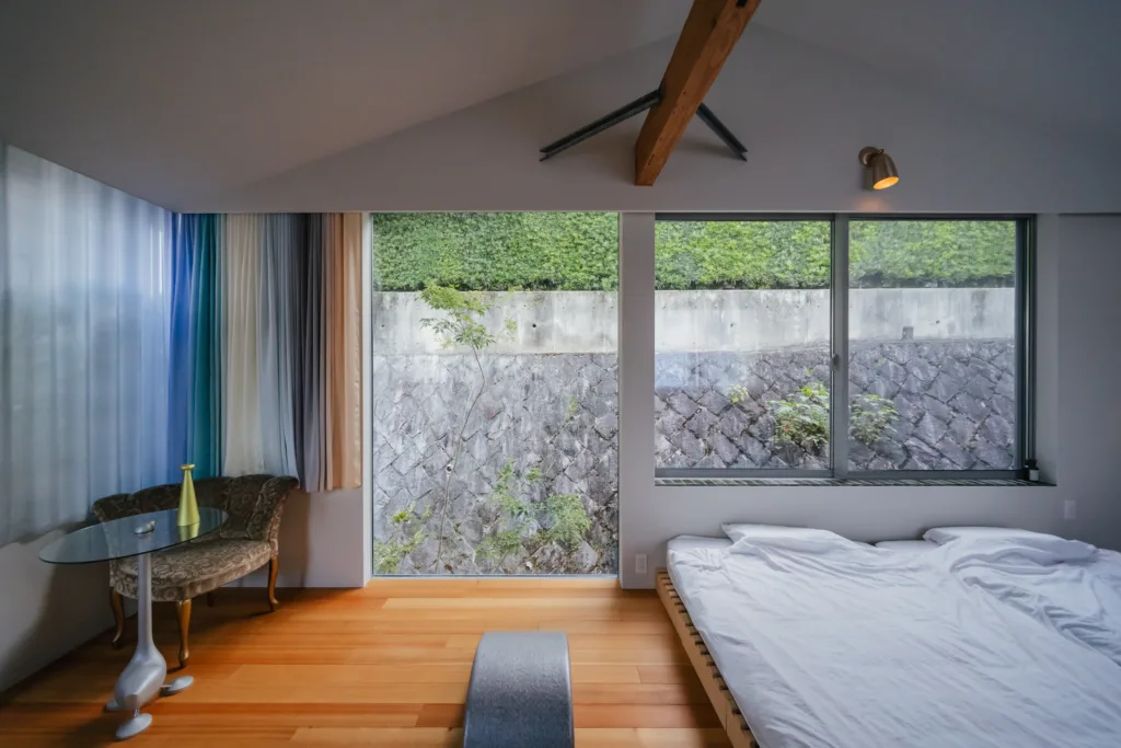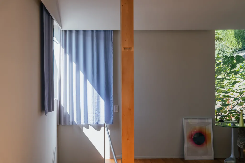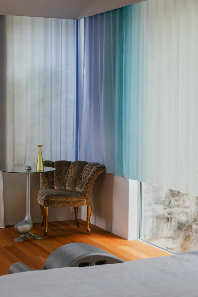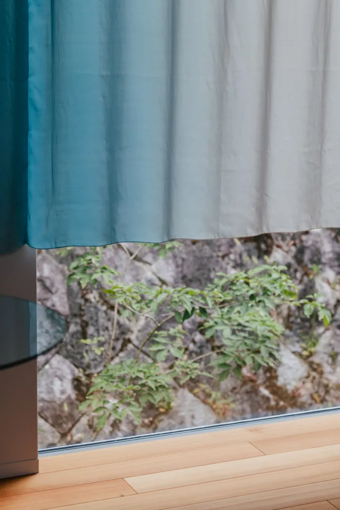 カーテンがカーテンらしく、陽を遮るためだけに窓の前で静かに佇むよりも、窓を含む壁面全体で自由に動くことで、カーテンの色濃度や反射現象が変化する。