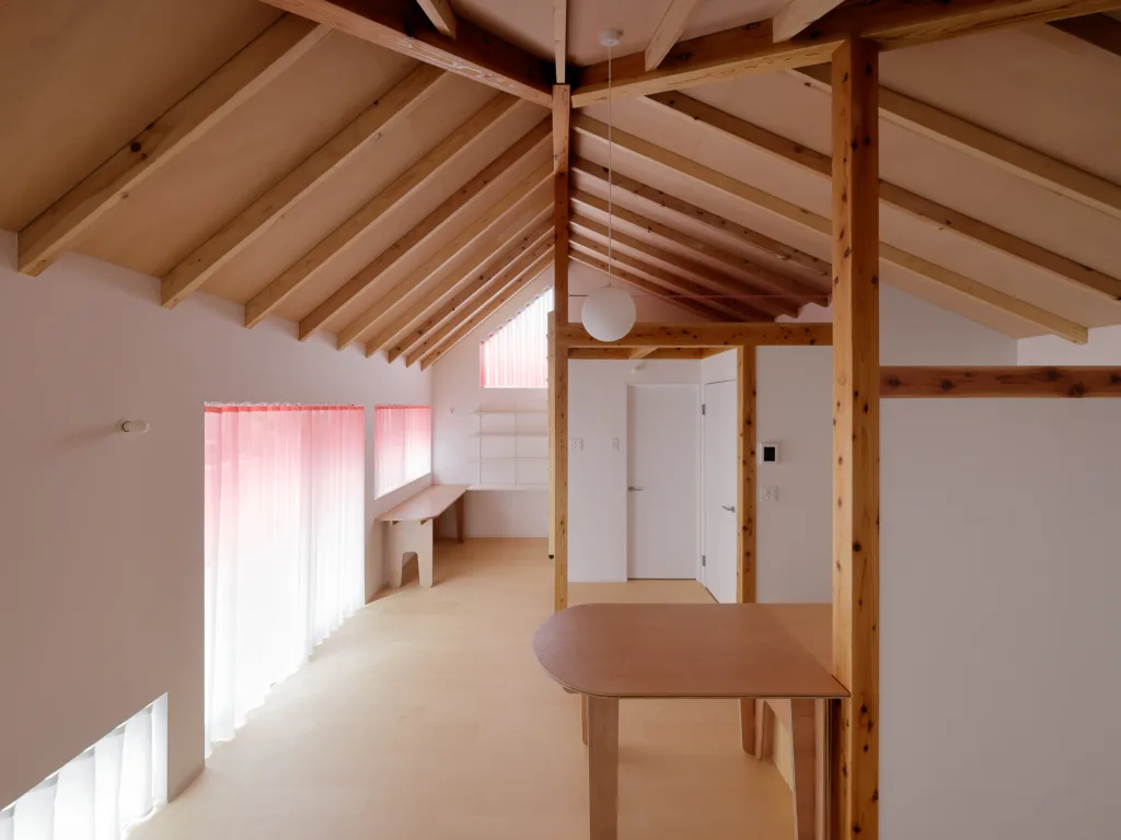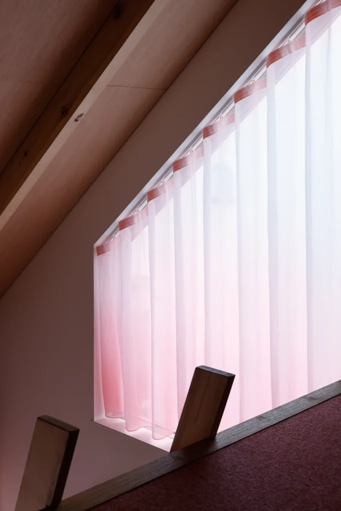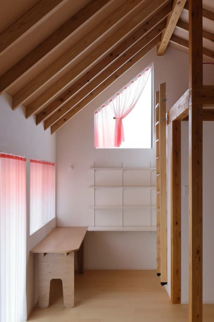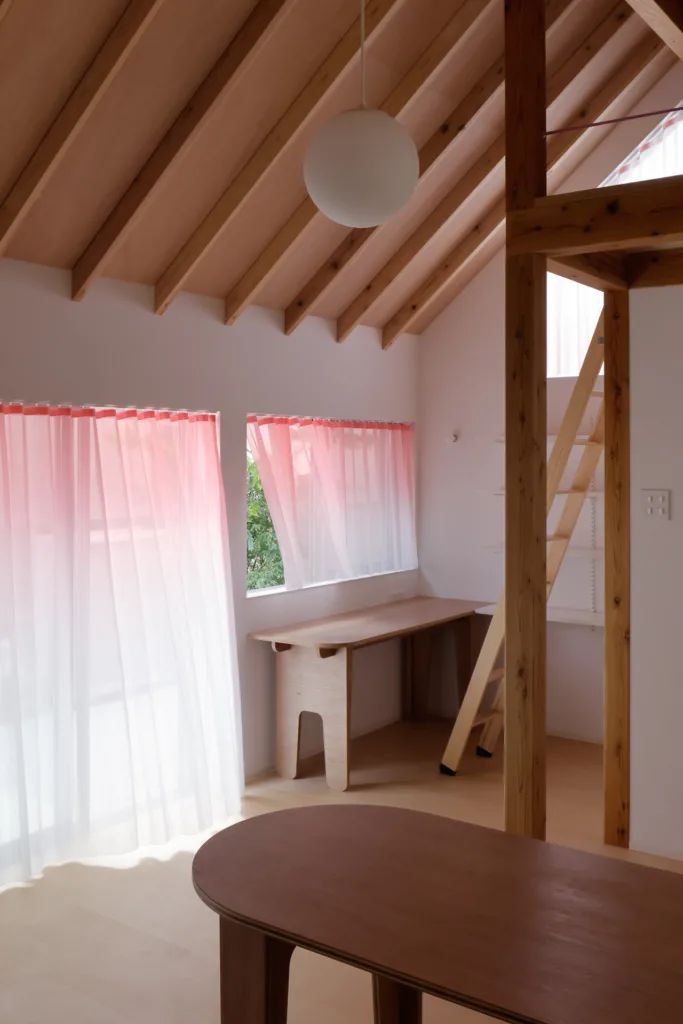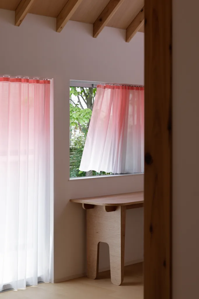 一軒家の隣にできた娘さんのための離れ。母屋と離れをスラーで繋ぐように、庭に面した大小の窓たちを淡いピンクの色によって緩やかに繋ぐ。下から上へ、ロフトの敷き込みカーペットのピンクに繋がるように、カーテンだけでなく室内全体に色の流れを生み出した。